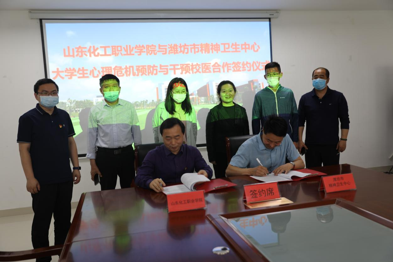 潍坊市精神卫生中心心理咨询中心副主任孟亮亮,心理咨询师崔志霞,我校副校长冯喜成,管理工程学院党支部书记朱彬彬、航空学院党支部书记刘建伟、五年高职学院党支部副书记任腾飞、机电工程学院党支部副书记范兴凯、化学工程学院党支部副书记王恒磊、基础教学部党支部副书记吴宁霞参加本次《大学生心理危机预防与干预校医合作协议书》签订仪式。仪式上,双方都高度重视此次合作,一致表达了对构建社会心理服务体系,提高大学生心理健康水平,医校共建、协同发展的美好期愿。