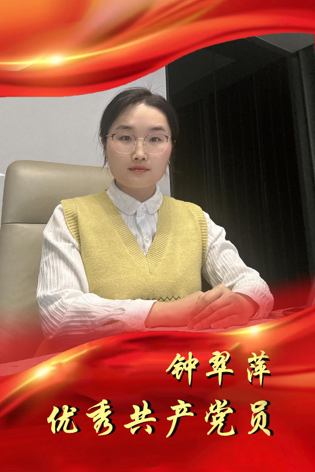 钟翠萍,汉族,1992年3月出生,2015年7月加入中国共产党,2017年6月参加工作,现为学校党委组织部组织干事。该同志自从事党务工作以来,以坚强的党性为后盾,以政治责任感为动力,在党务工作上兢兢业业、恪尽职守、辛勤工作,以高度的责任感和强烈的事业心,出色地完成了上级党组织及学校党委赋予党务工作者的光荣任务。