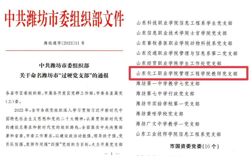 近日,中共潍坊市委组织部印发《关于命名潍坊市“过硬党支部”的通报》,我校管理工程学院教师党支部荣获潍坊市“过硬党支部”荣誉称号。