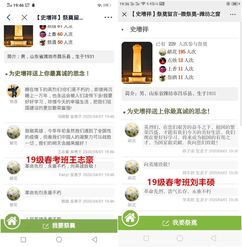 清明节期间,同学们利用电脑、手机登陆潍坊市网络祭奠英烈平台,在网上向先贤先烈鞠躬献花、签名寄语、慎终追远,表达对英烈的感恩与敬仰,每一束鲜花、每一句祝福、留言,都是对已逝英烈最真挚的哀悼,最崇高的敬意!