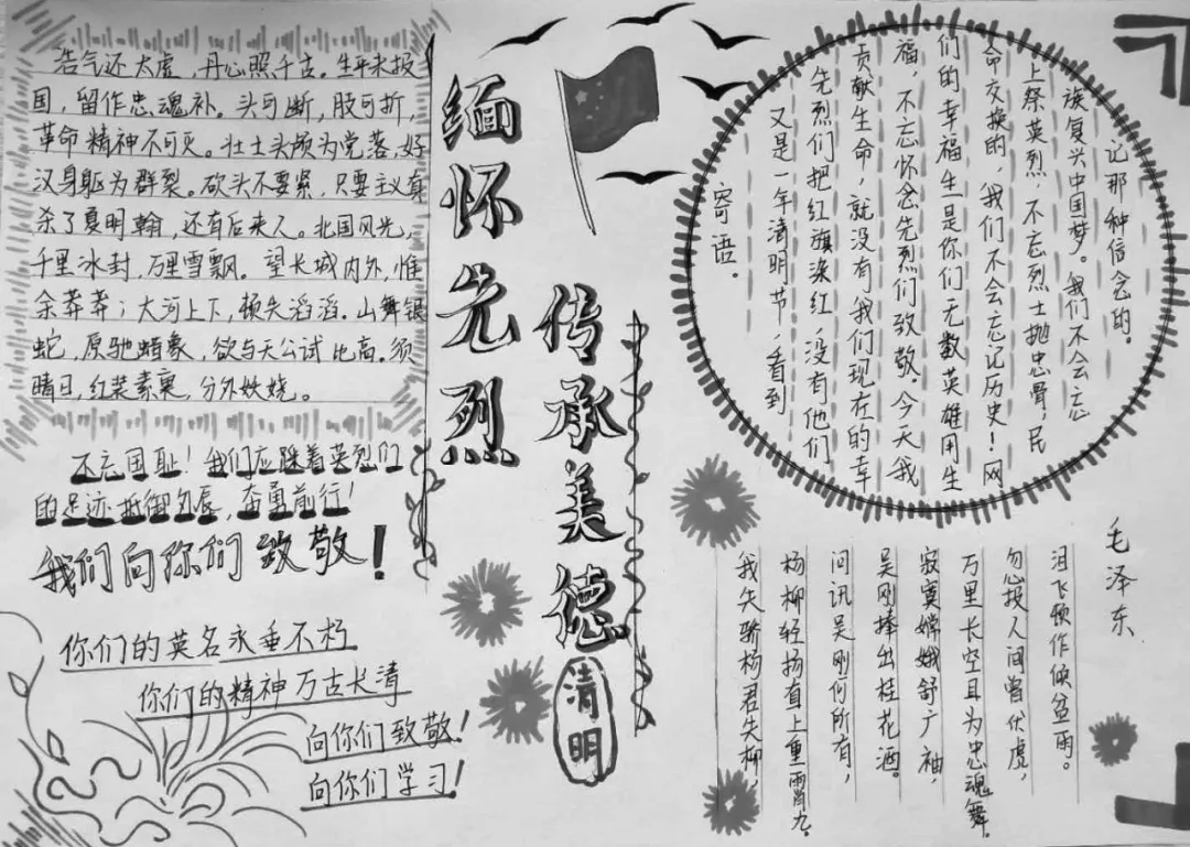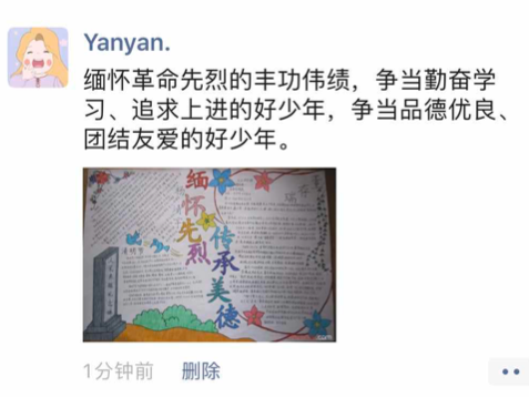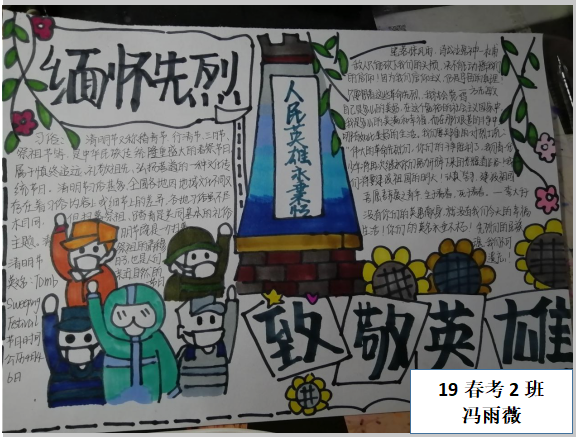 同学们在微信、QQ等社交软件的朋友圈,发布手写祭奠英烈寄语、致敬英雄手绘画等作品,以此表达对革命先烈的景仰和追思。一张张精美的手抄报,一段段饱含深情的文字,寄托同学们对革命先辈、英雄的缅怀之情。