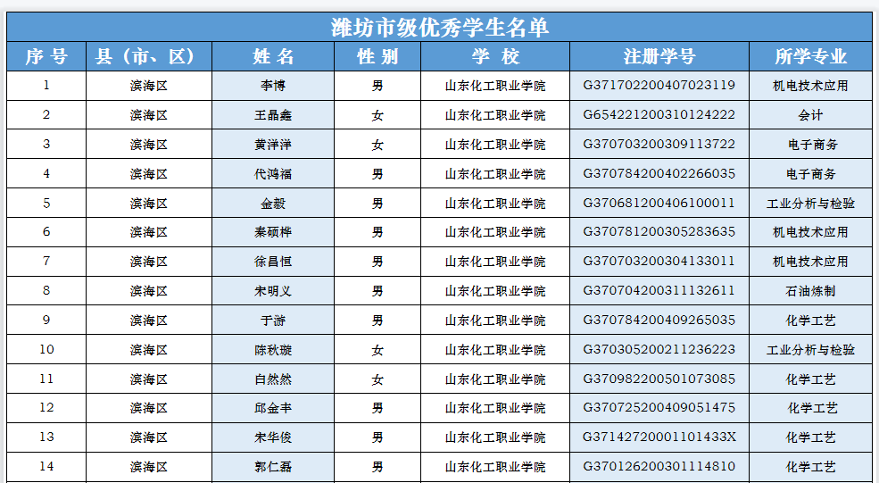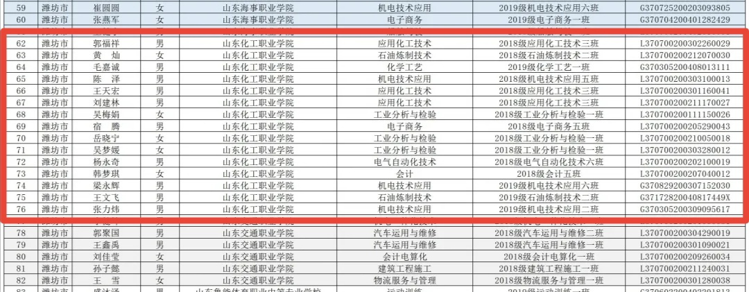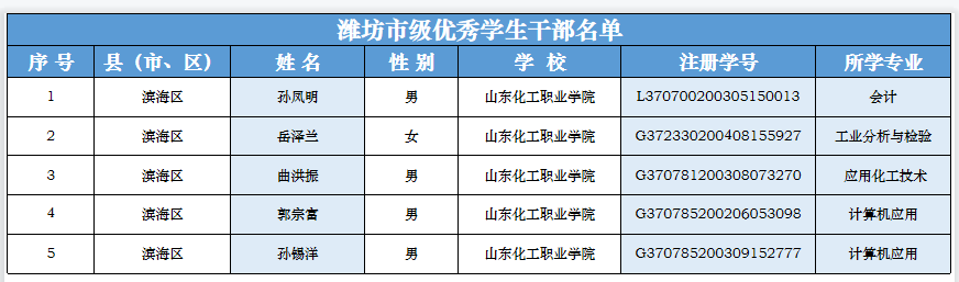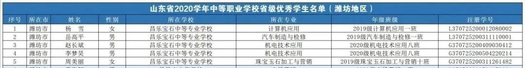 山东省2020学年中等职业学校省级优秀学生干部名单(潍坊地区)