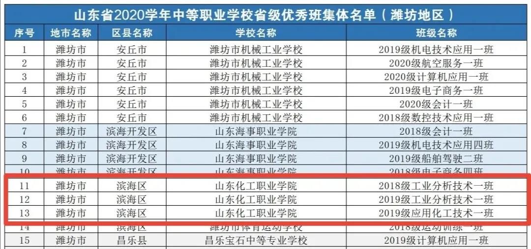 潍坊市市2020学年中等职业学校优秀班集体名单