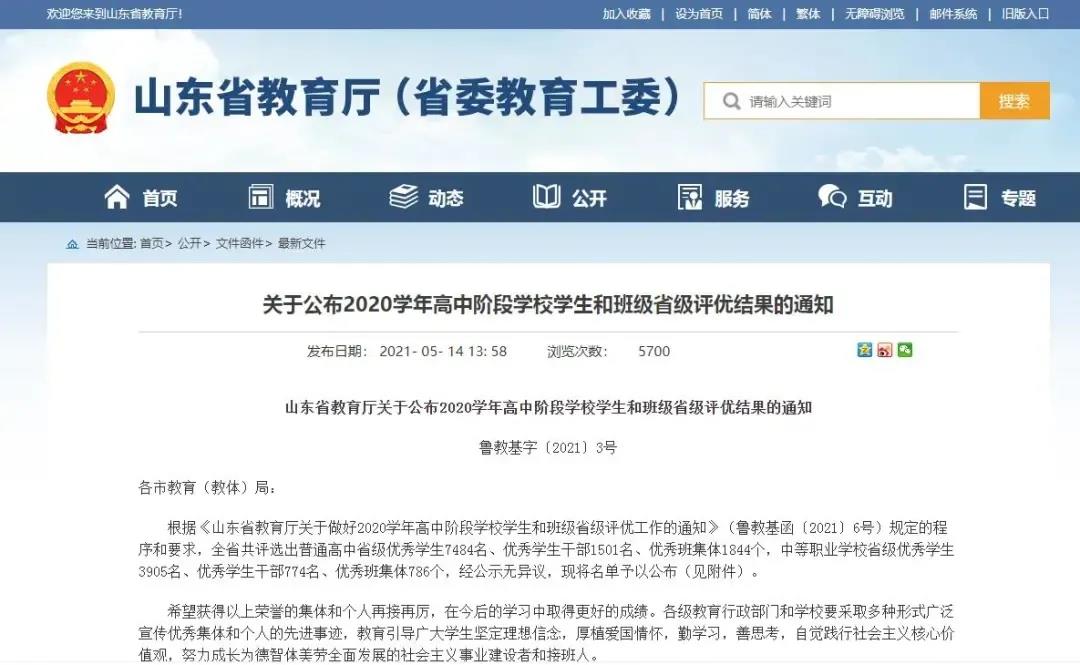 近日,山东省教育厅发布《关于公布2020学年高中阶段学校学生和班级省级评优结果的通知》,我院学生成绩优异,共有54人次(个人及集体)获奖。