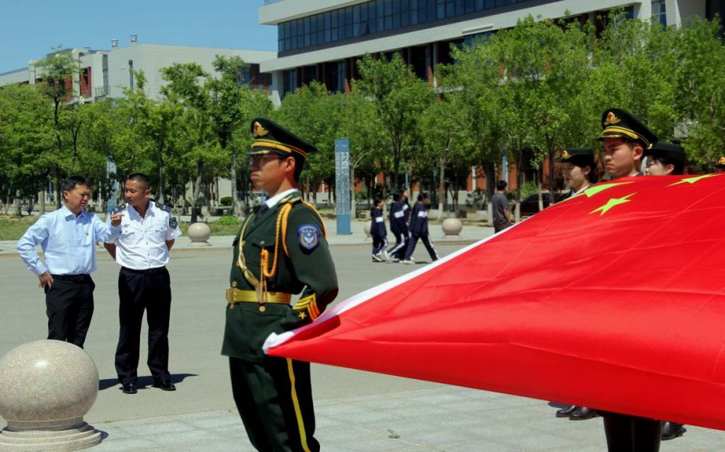 当学校党委副书记潘慧以及相关部门负责人走到东校区广场时,国旗护卫队迈着整齐的步伐,昂首挺胸护旗入场,他们庄严肃穆的仪态赢得了在场师生的阵阵掌声。学校领导和观看的师生们纷纷拿出手机或相机记录下这精彩瞬间。
