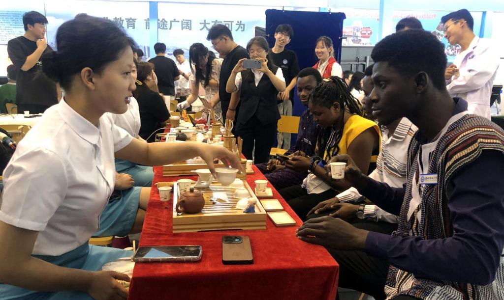 学校副校长冯喜成来到展示现场,对她们熟练的茶艺展示给予了充分肯定;在展示现场,一群国外留学生看到茶艺展示,产生了浓厚的兴趣,纷纷坐下来观看演示,认真品茶,并用简单的中文就茶文化知识进行咨询,茶艺队与他们互动交流,让他们有机会亲身参与其中,感受中华传统文化的魅力。这种互动式的展示方式,不仅增强了观众的参与感,也进一步推广了中华传统文化。