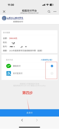 (2)在缴费详情页面查看缴费详情,核对无误点击“下一步”进入支付界面,确认无误后点击“在线支付”,随后选择微信或支付宝进行支付即可。