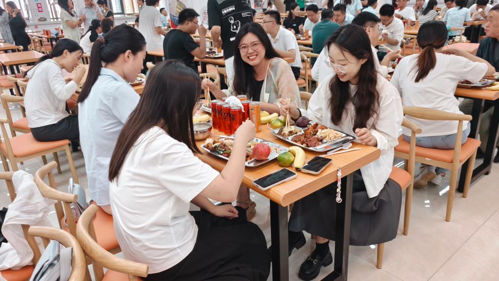 教师节当天,餐厅专门布置了彩虹拱门,悬挂了热烈庆祝教师节的横幅,整个餐厅洋溢着节日的喜庆氛围。餐厅工作人员早早就忙碌起来,他们准备了丰盛的午餐、提供了免费的饮料、精心设计了庆祝蛋糕,力求将每一份心意都融入到美食之中。活动现场,学校校长贺志强、校长助理李凤娟共同为老师们切分蛋糕,一同庆祝教师节。教师们围坐一堂,品尝着美食和蛋糕,这样的庆祝方式既温馨又富有意义,让人倍感温暖和鼓舞。
